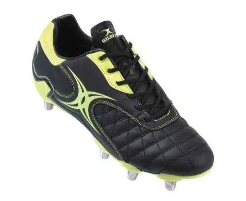 Gilbert excel in creating rugby boots which offer performance, support and comfort to suit your rugby demands. The Sidestep Revolution SG Rugby Boot is a revamp of the classic Sidestep model and features a durable synthetic leather upper for optimum comfort and durability. With quality, reliability and a classic design, these rugby boots are the ideal cost effective offering for players at all levels. You can tell the Sidestep Revolution means business on the rugby field as the inclusion of eight metal screw in studs ensure powerful forward play on soft natural surfaces. When you are looking for something rather understated but that suits the modern game then this latest look is sure to prove a winner. A standard black design is brought to life as the addition of lime makes for an energetic look that is sure to boost your game or training. This boot weighs 328g (UK size 8). Make sure you kit yourself out with a spare set of rugby studs .